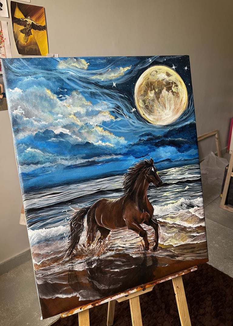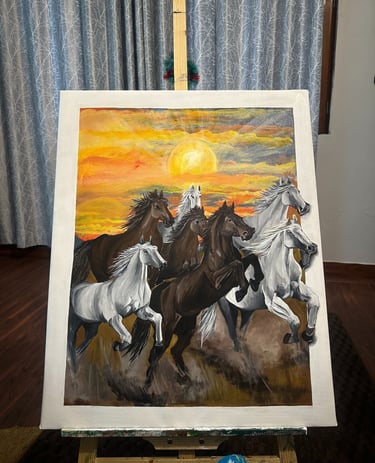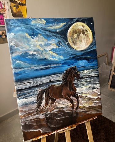 While Purvi is still exploring and shaping her signature style, her heart gravitates naturally toward nature-inspired art—water, fields, landscapes, and especially horses. These elements embody freedom, strength, serenity, and movement, all of which flow seamlessly into her paintings.
